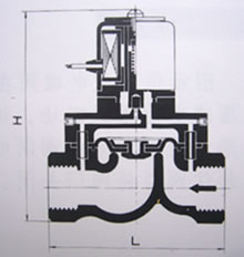 该阀是利用电磁铁进行操作的先导,浮动式膜片结构常闭型二通电磁阀。图示为关闭状态。此时,是靠作用在膜片上腔工作介质的压力进行关闭的。当通电时,动铁芯被电磁铁吸起,开启先导阀孔口,将膜片上腔压力释放,形成一个不平衡压力,利用管路压力将膜片上推,离开主阀孔口,开启了阀门。当断电时,动铁芯关闭先导阀孔口,管路压力通过旁通孔施加于膜片上腔,形成一个关闭力,使阀门严密关闭。